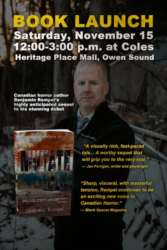 Mutate Book Launch Saturday, November 15, 2025 12:00 p.m. 3:00 p.m. Coles 1350 16th St E, Owen Sound ON N4K 6N7 Owen Sound Canada (map) Google Calendar ICS